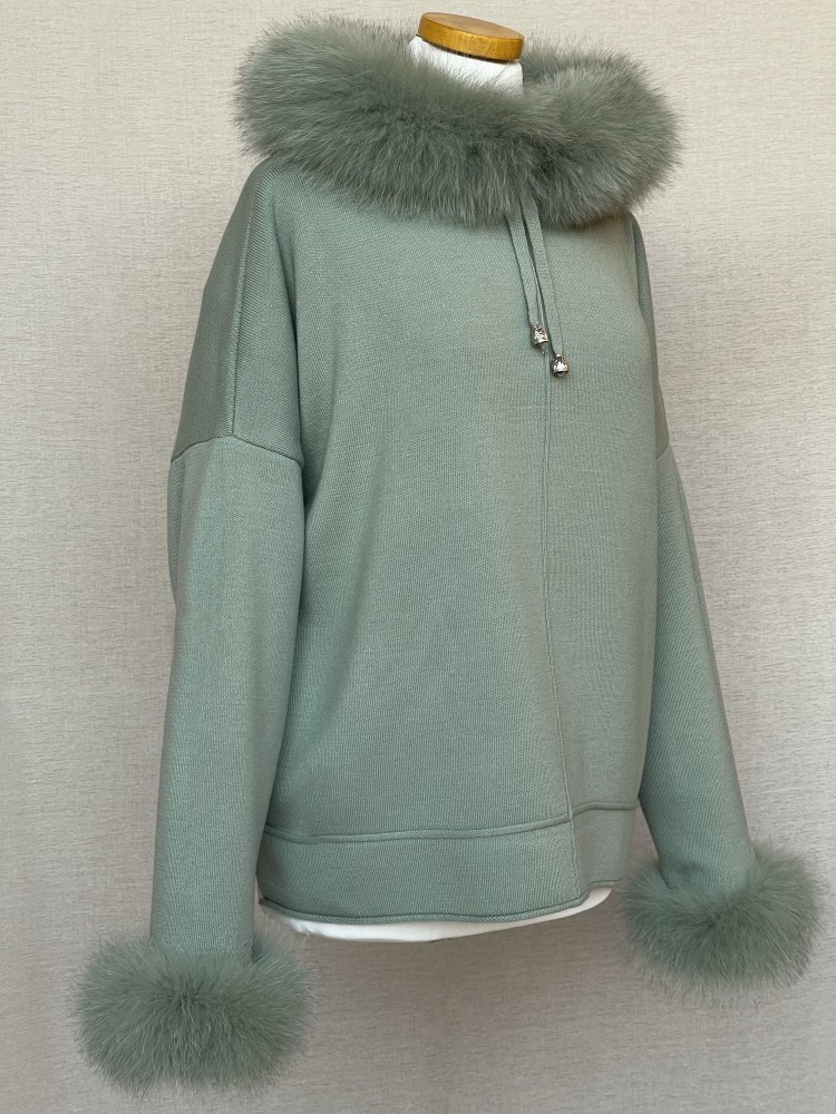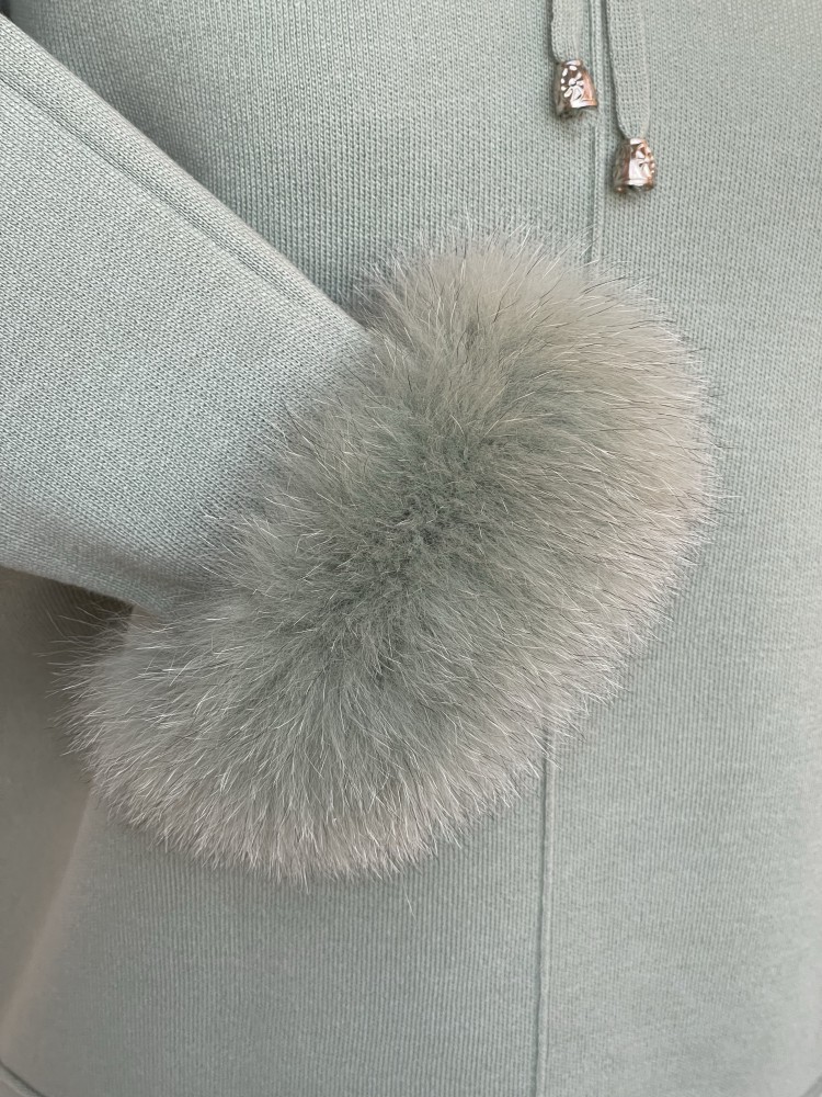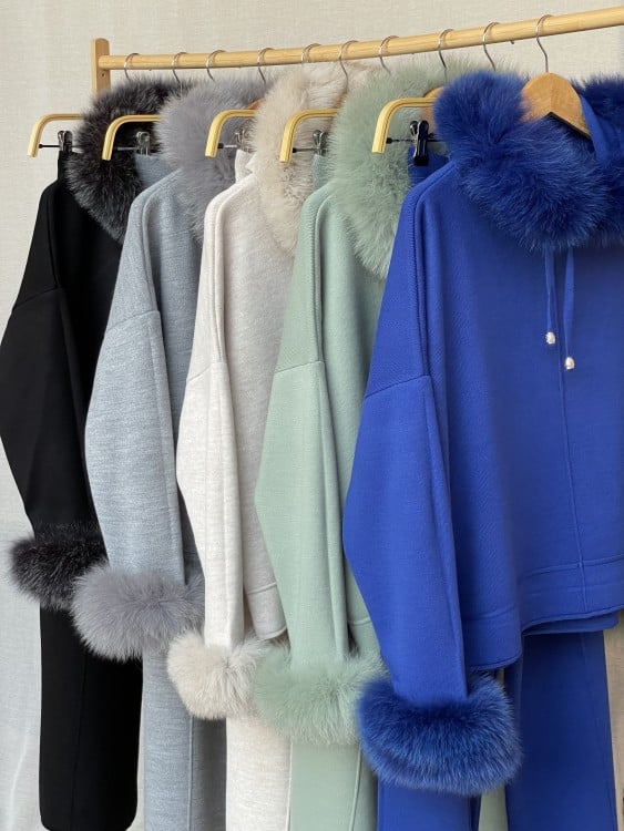 يتميز بلمسات من الفرو الطبيعي الفاخر على الأكمام والياقة والحواف، مما يمنحه مظهراً جذاباً وأنيقاً ✨