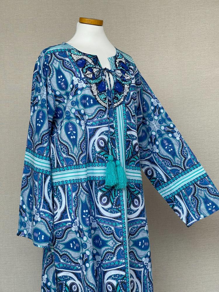 فستان أنيق مستوحى من التصاميم الشرقية الفاخرة، يتميز بنقوش هندسية وزخارف متداخلة بدرجات الأزرق الهادئة. يزين الصدر شك فاخر مع خرز برّاق يضفي لمسة فخامة. ويتميز بقصة مستقيمة وفتحات مع كلا الجانبين. تصميم الأكمام الواسعة يضفي راحة وأناقة، مما يجعله خيارًا مثالياً للمناسبات المميزة 🪡✨